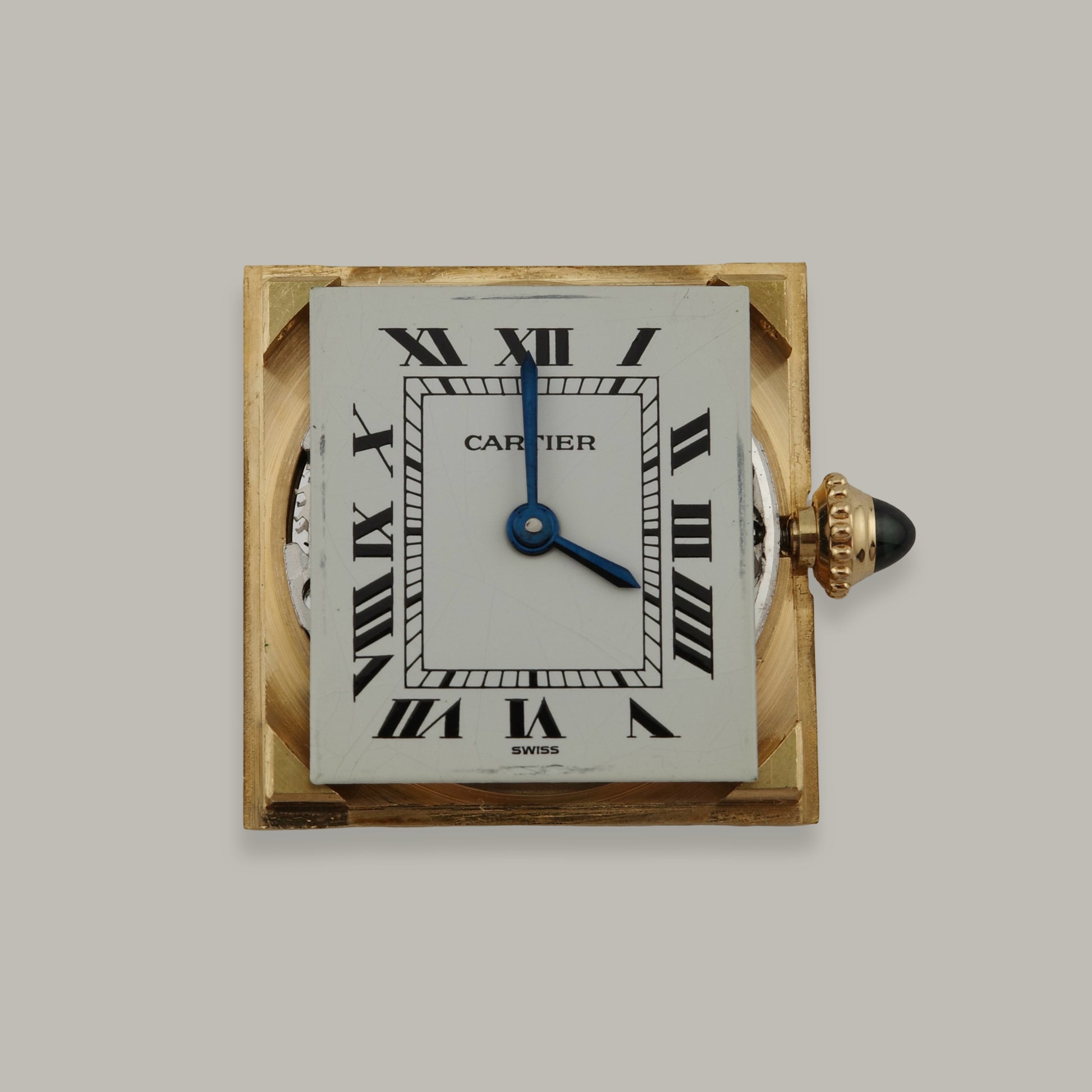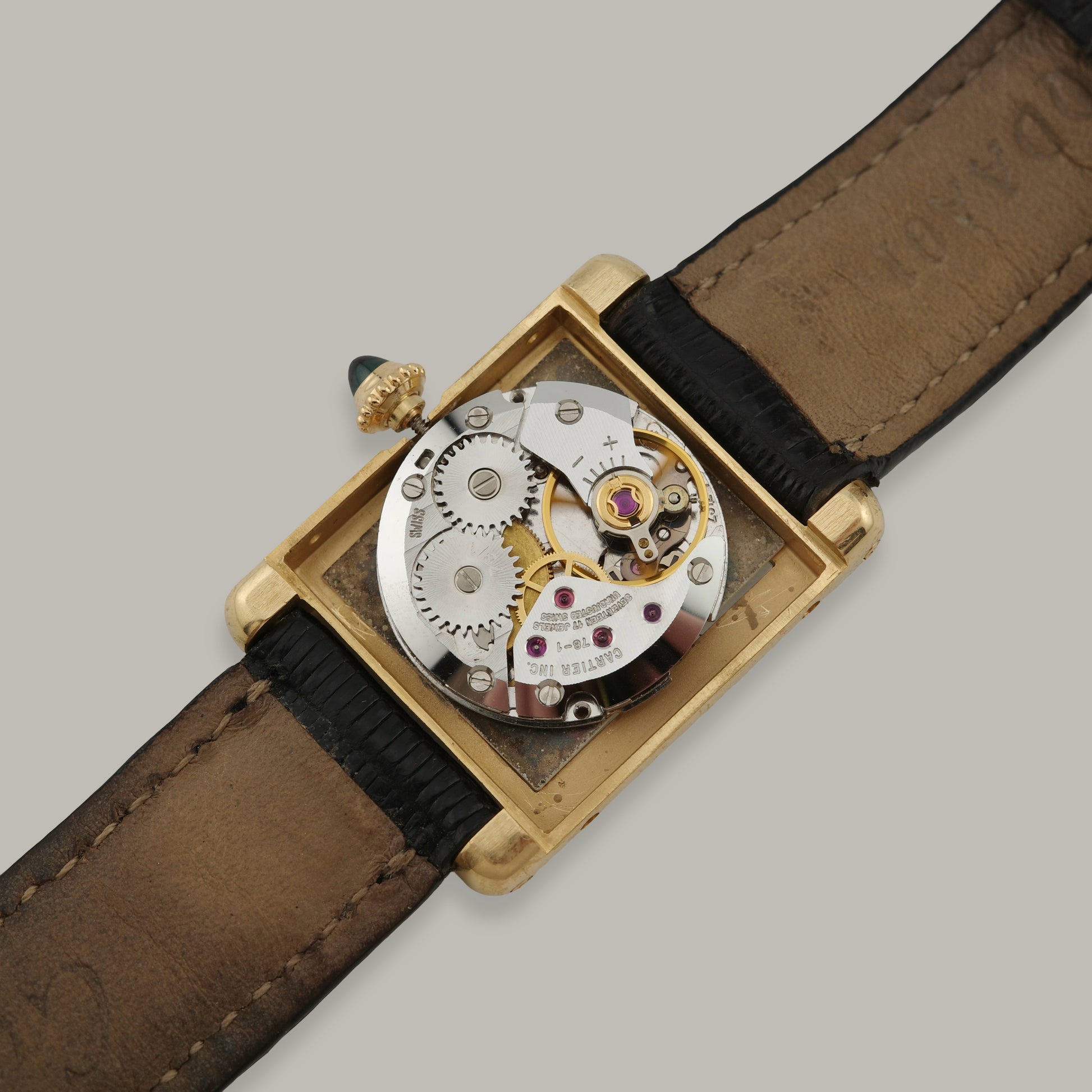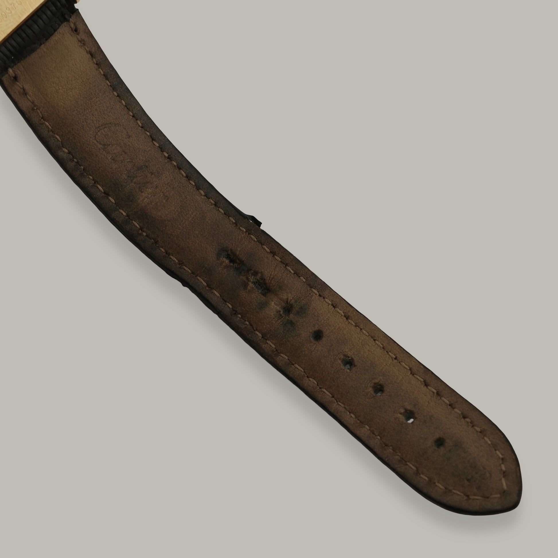 Very Good vintage condition. Watch has likely been lightly polished but is in strong condition with a sharp & visible hallmark under crown (which is usually polished off) and clear engravings on caseback. Case shows signs of moderate use including medium scratches and indentations. "Spider" dial shows medium even crazing/cracking throughout the lacquer but no chips or missing pieces. The dial also has some light spotting around the edges. Crystal shows minor scratches and wear. Cartier-signed black lizard strap shows moderate signs of wear and discoloration. Watch comes with an 18K yellow gold pin buckle signed "UNROC".
