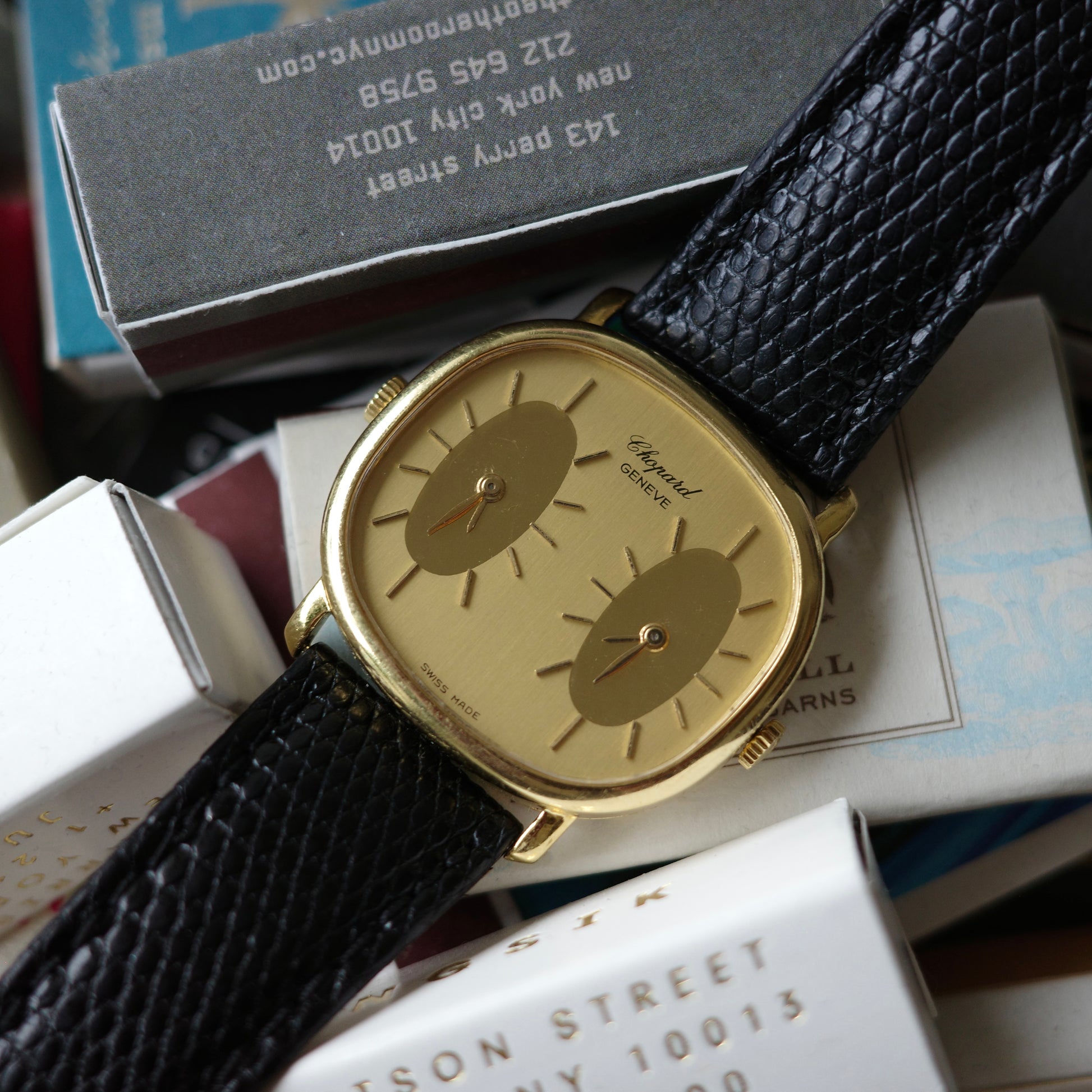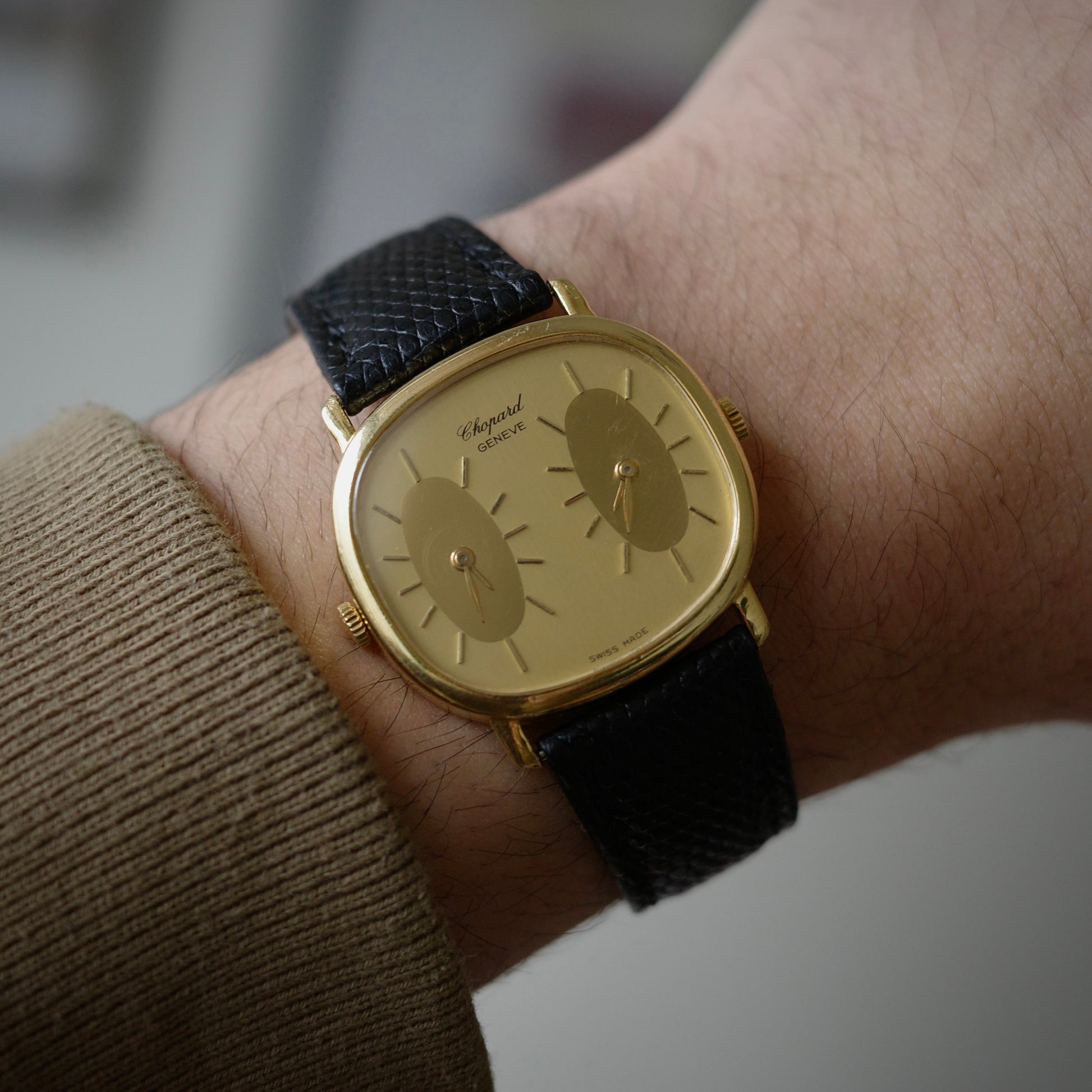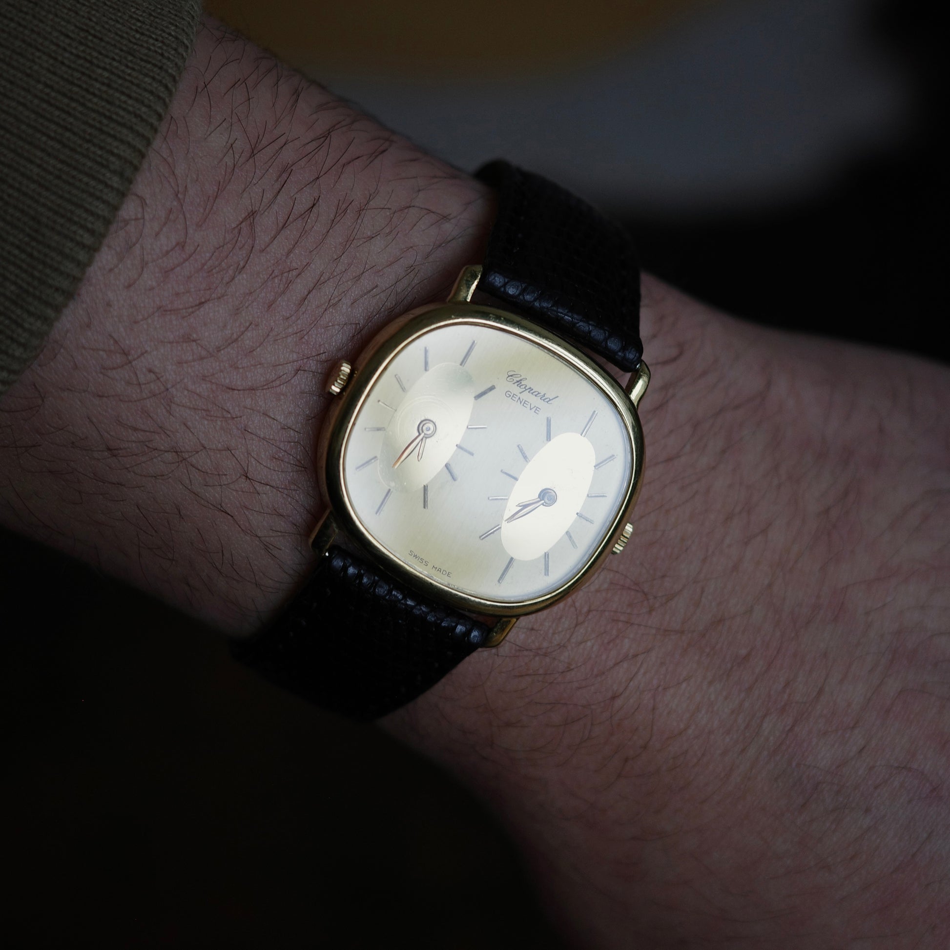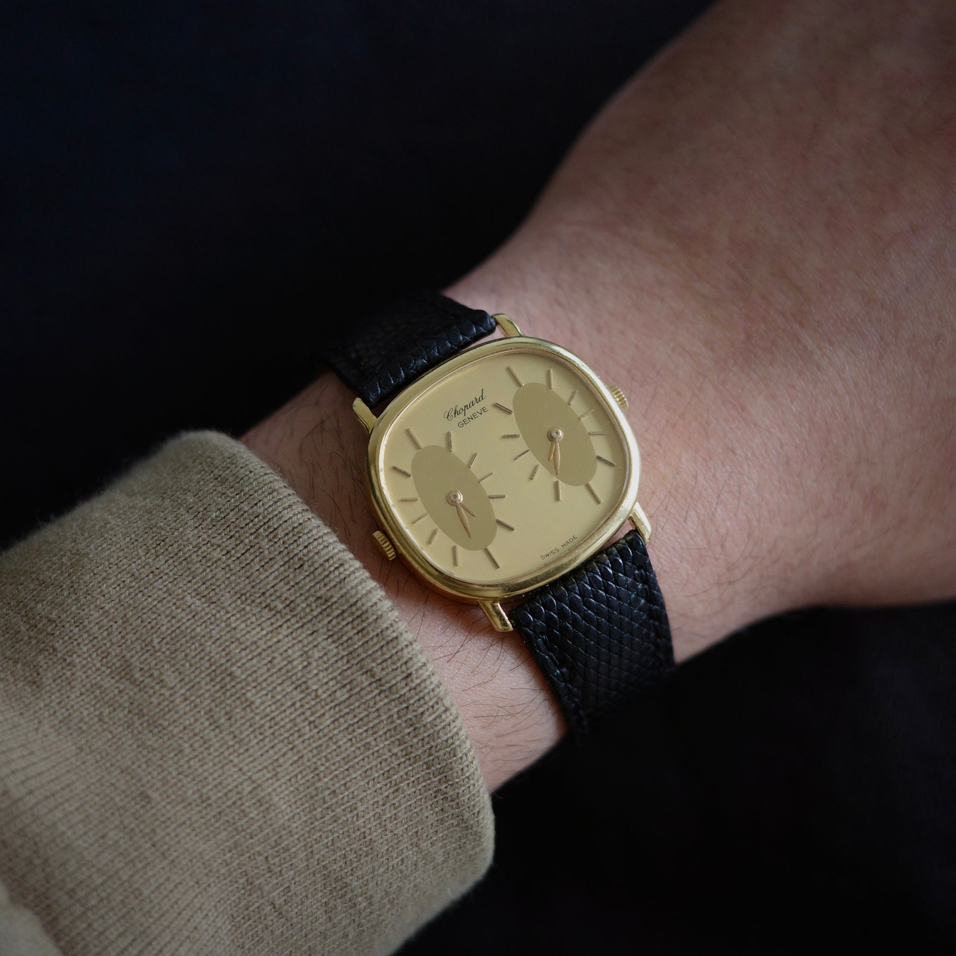 If you want your watch to speak for itself, look no further. The Chopard reference 2104-1 makes its presence known immediately with two oversized dials sharing a single case, a bold and almost surreal interpretation of a dual time watch. Rather than hiding the complication like most brands, Chopard leaned into it, giving each time zone its own full display, perfectly balanced across a brushed and mirror-finished dial that plays beautifully with light.