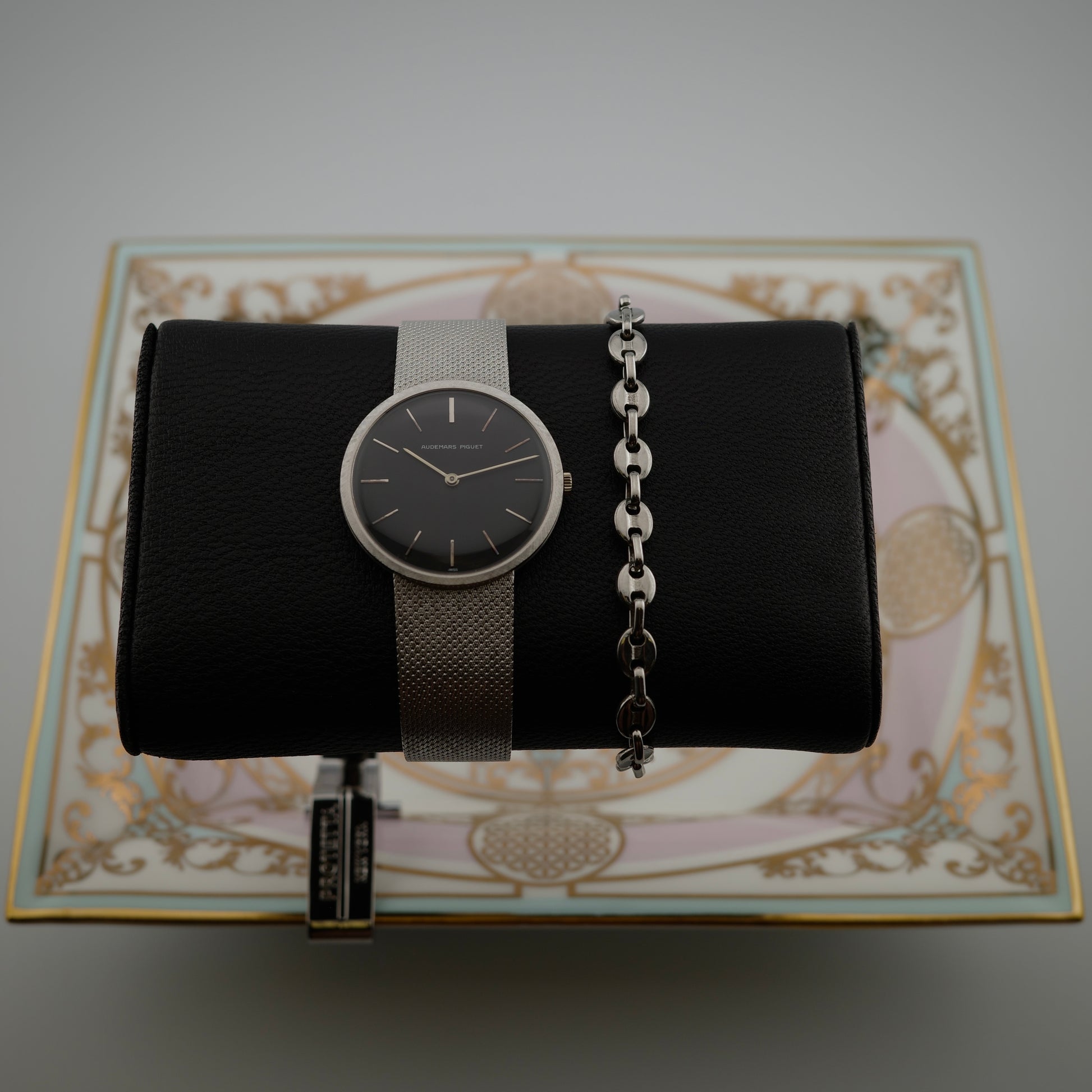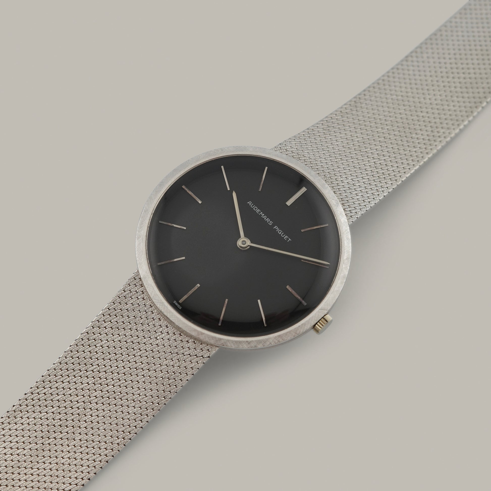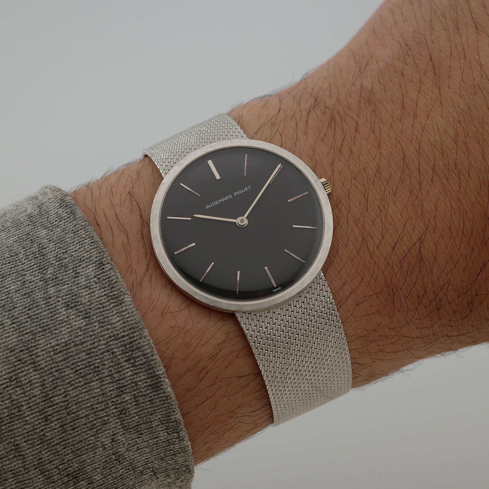 If you only think about Royal Oaks or Offshores when you hear Audemars Piguet, then you're missing out on some amazing vintage watches. This watch was produced in the 1970s and features a solid 18K white gold case, a perfectly-preserved rare black dial and and the thin manual-winding AP Cal. K2001/1A. The value for the price of vintage Audemars Piguet dress watches is unbeatable, and unfortunately there hasn't been any watch even remotely similar to this design language in Audemars Piguet's catalog in decades. It's a minimalist watch that is strong in details, like it's uncommon cross-hatch Florentine-style finished bezel, pencil hands and woven integrated bracelet.