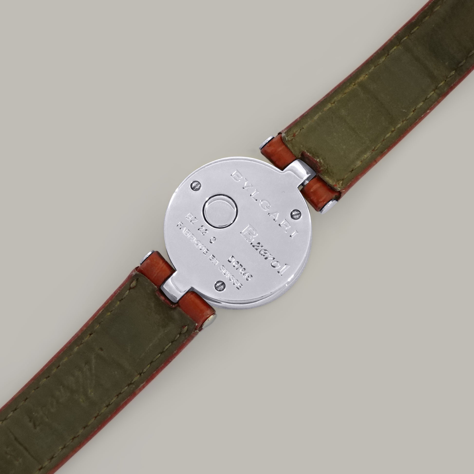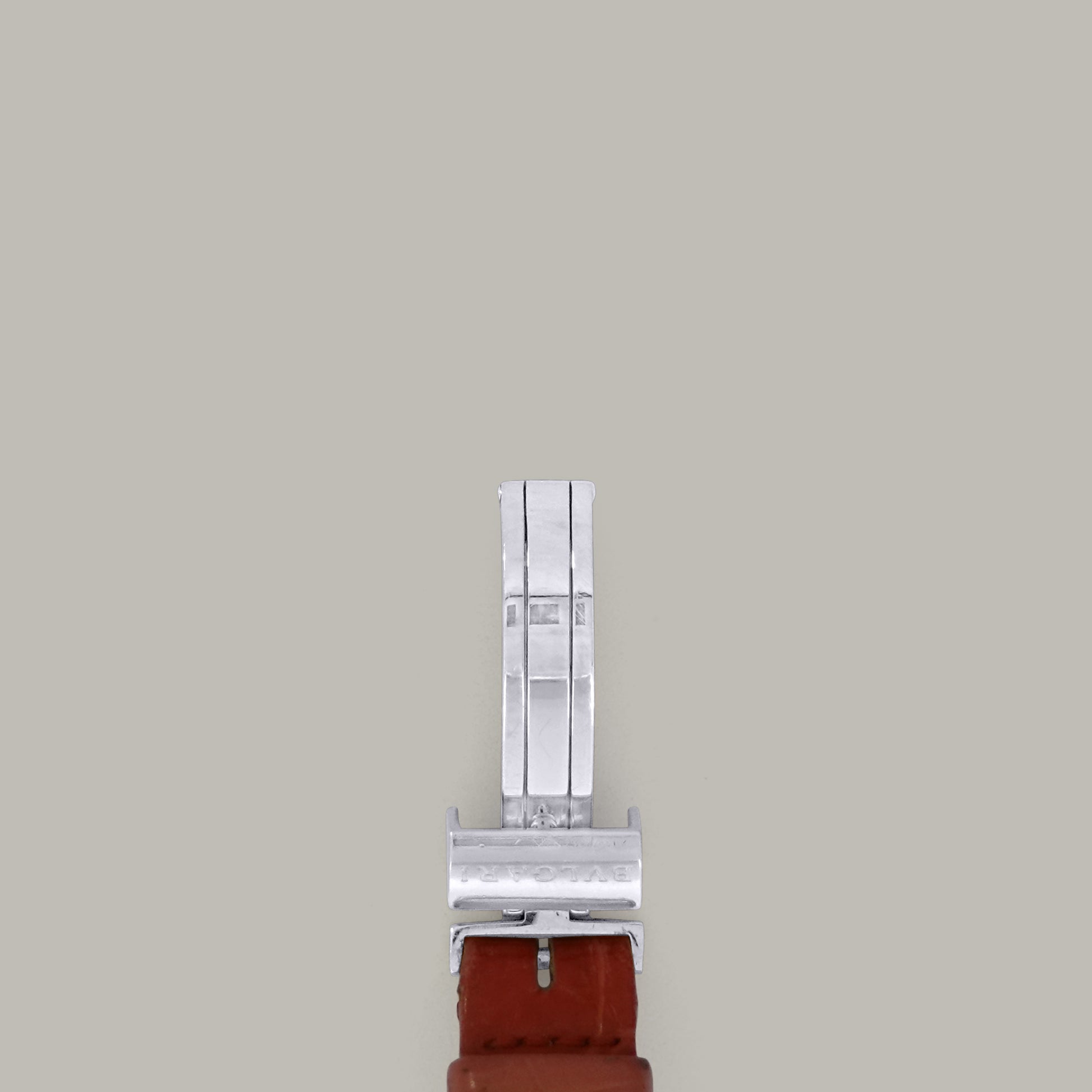 Very Good overall condition. Case has moderate scratches and indentations throughout. Mother of Pearl Dial, hands and crystal are in near-mint condition with no signs of wear. Generic strap shows moderate to heavy signs of wear and discoloration. Original Bvlgari deployant clasp has moderate scratches throughout. Watch meets expected timekeeping standards.