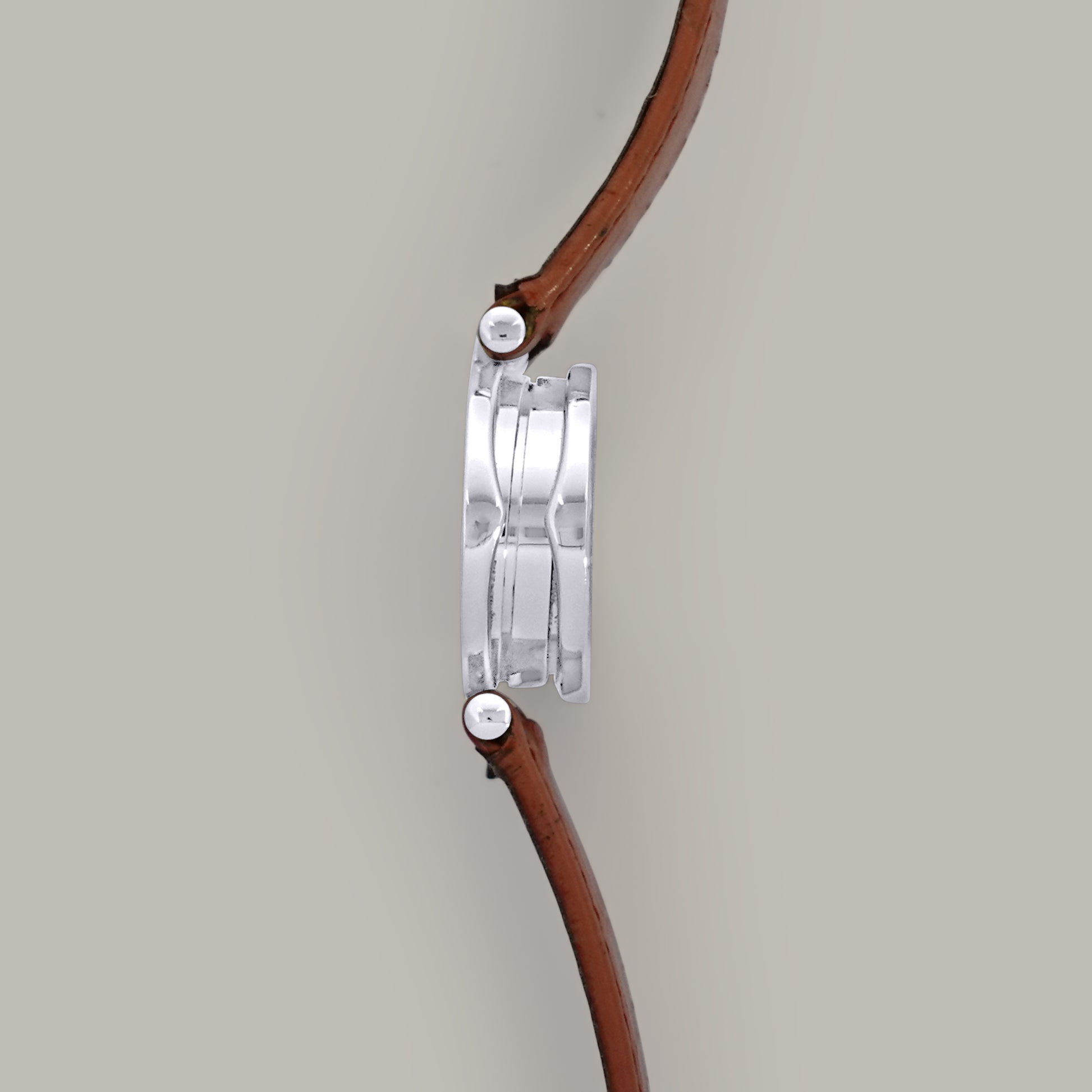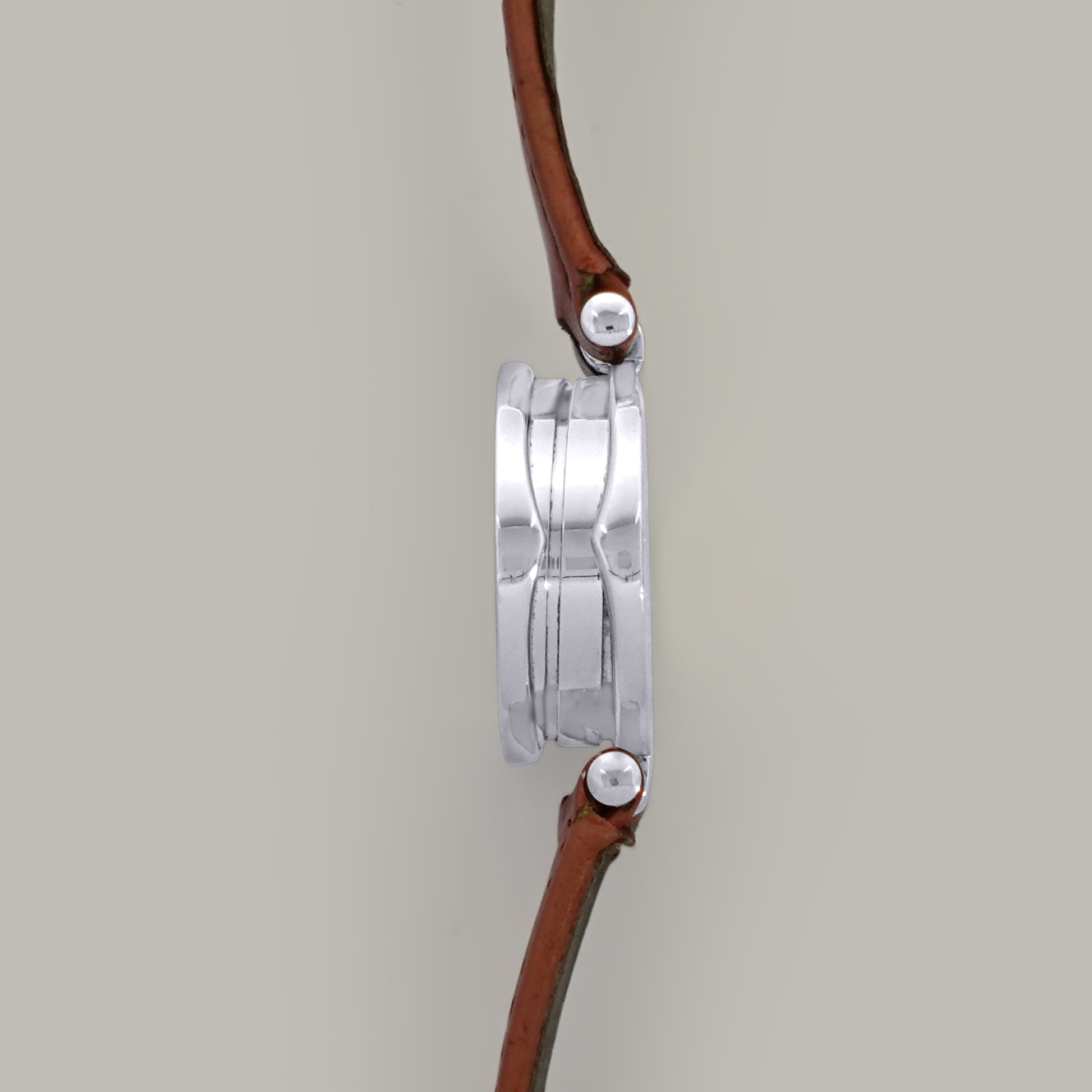 First introduced in 1999, the Bvlgari B.zero1 collection takes inspiration from the iconic Colosseum, one of the world's most famous amphitheaters.The lack of a crown in the Bvlgari B.zero1 Ladies Watch creates a streamlined appearance and allows time to be changed via a corrector on the caseback. This example has a white mother of pearl dial, stainless steel case and red leather strap.