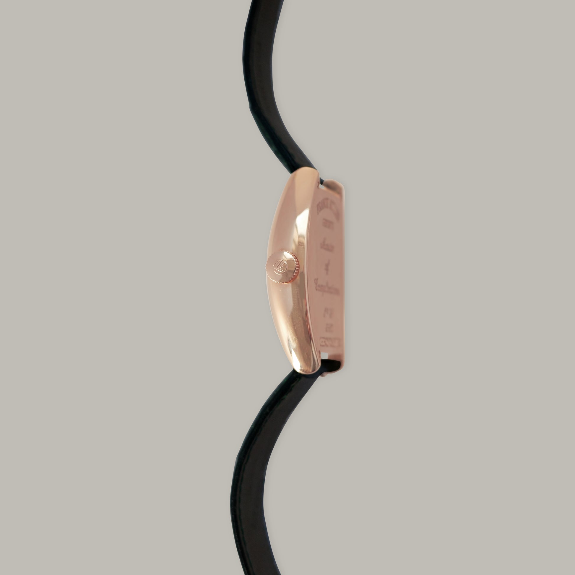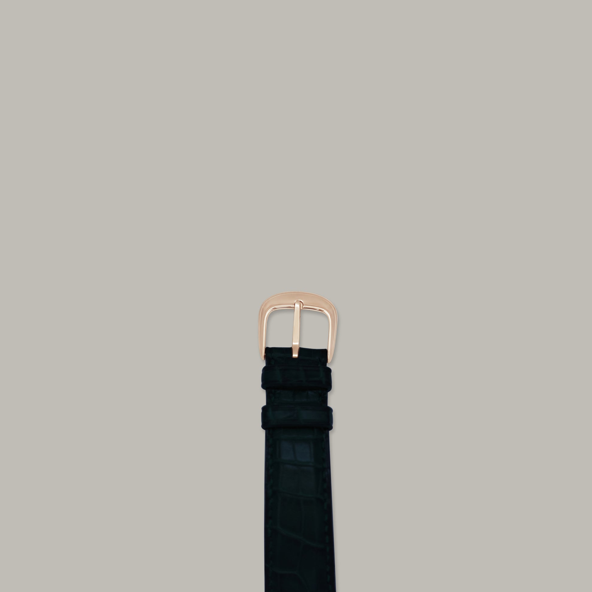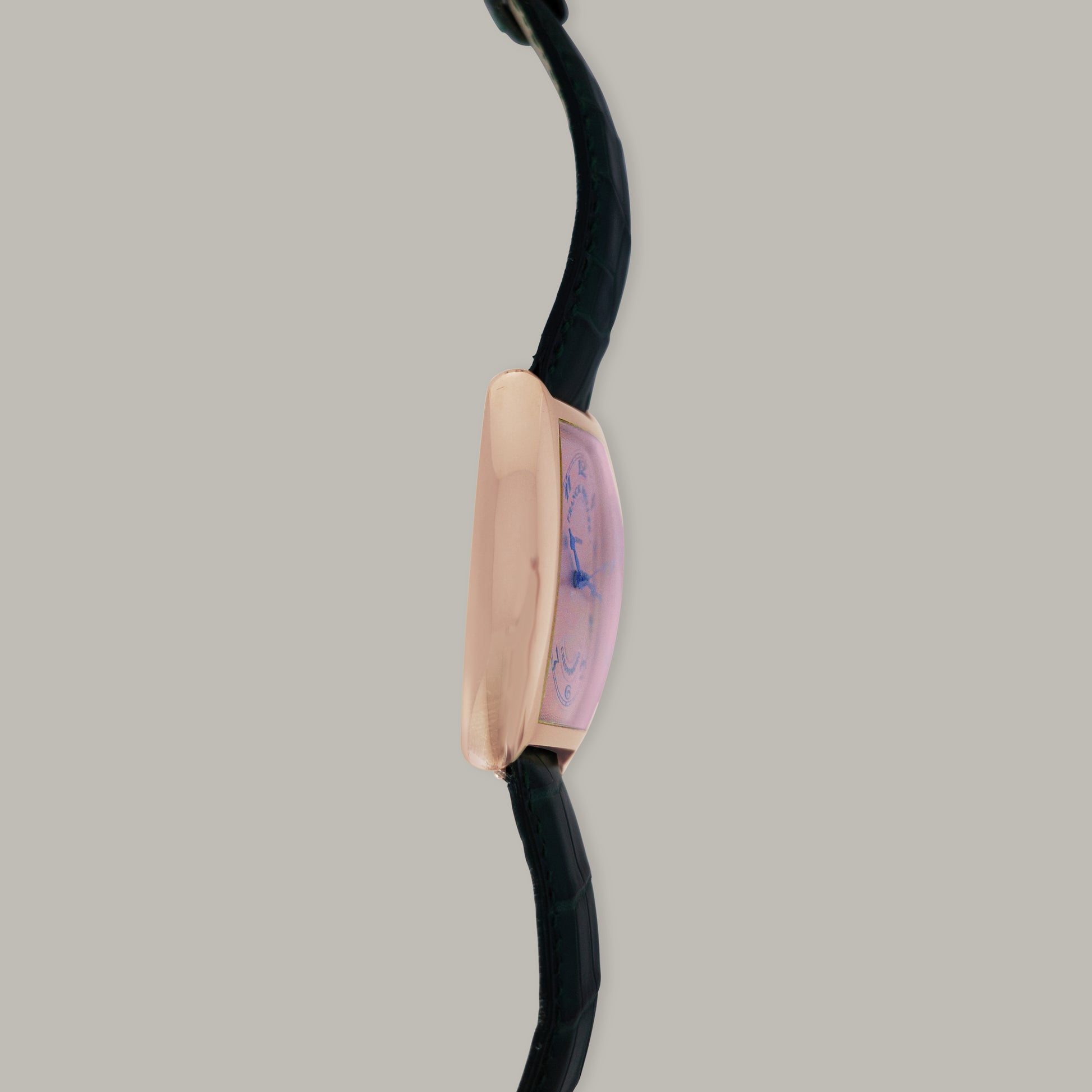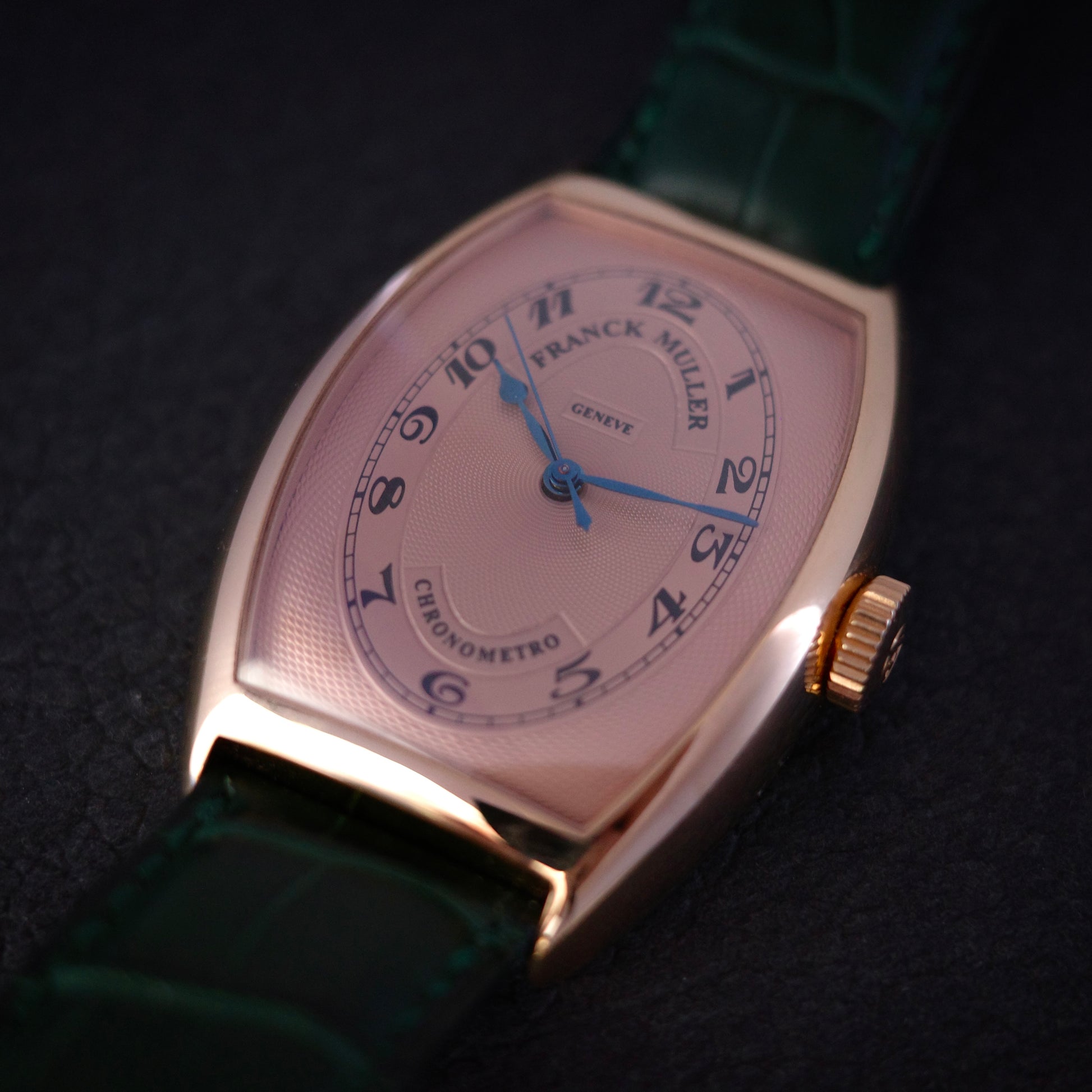 The Franck Muller Chronometro was available in a few different case sizes and metals, but we have never seen an example quite as special as this one. This version features a warm 18k rose gold case with a unique salmon guilloché dial and blued steel spade hands. Paired with a green FM alligator strap and its original 18kt rose gold buckle, this is a true collectors item and configuration that has yet to be found elsewhere on the market.