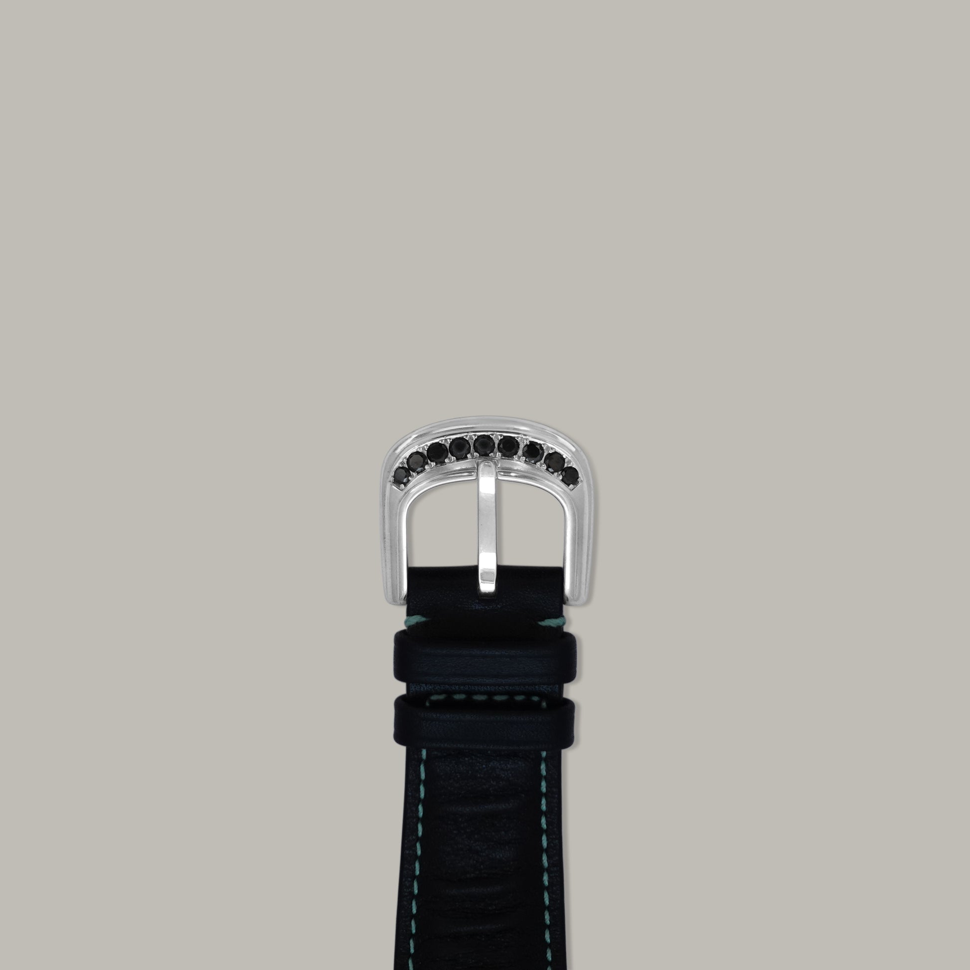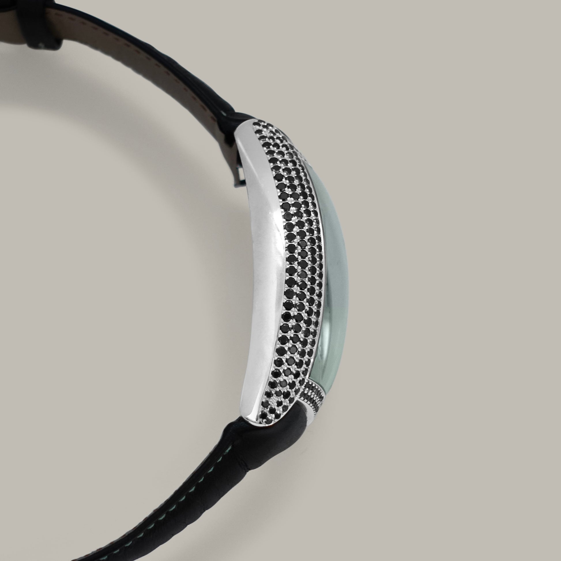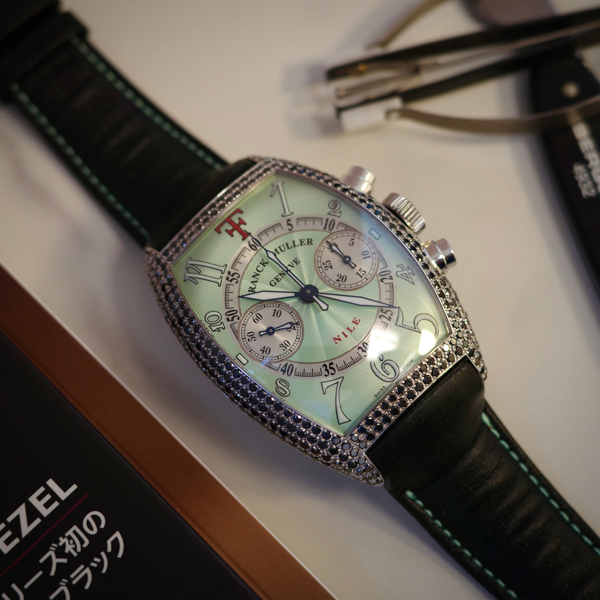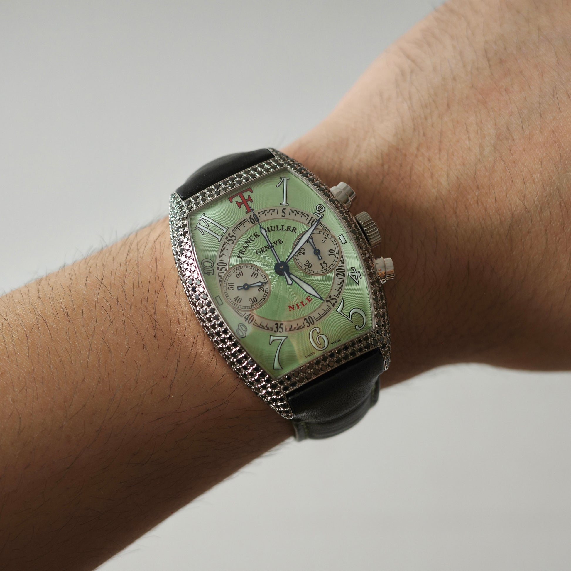 The case is crafted in heavy solid 18K white gold, with a tonneau shape that exudes Franck Muller's signature presence on the wrist. Set with brilliant-cut black diamonds along the case, lugs, and buckle, this piece diverges from the previously known 01/03 and 02/03 models, both of which featured white diamonds. The dial is finished in a striking mint green guilloché pattern, a rare aesthetic that complements the red “Nile” inscription and Theo Fennell’s signature at 12 o’clock. The original black leather strap, with matching mint green stitching, pairs seamlessly with the case and is secured by a white gold buckle set with black diamonds. The watch weighs over 150 grams.