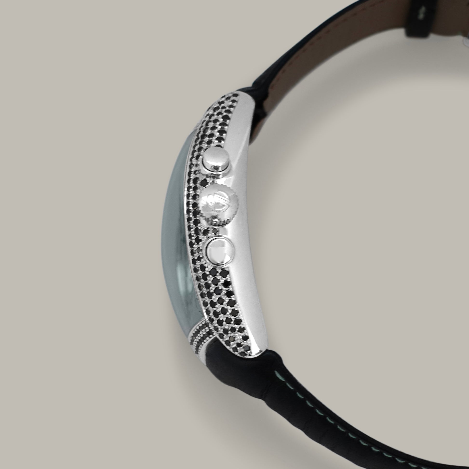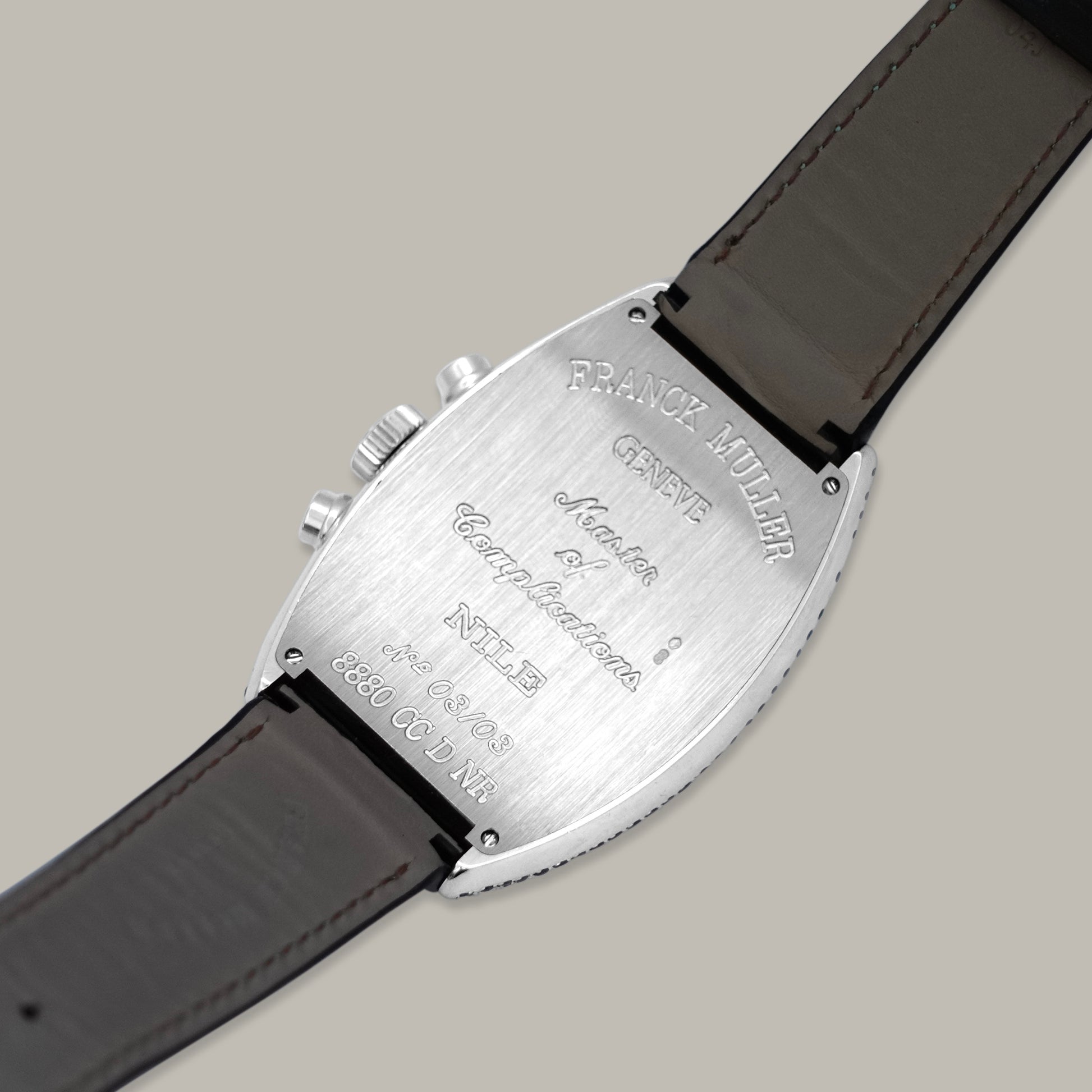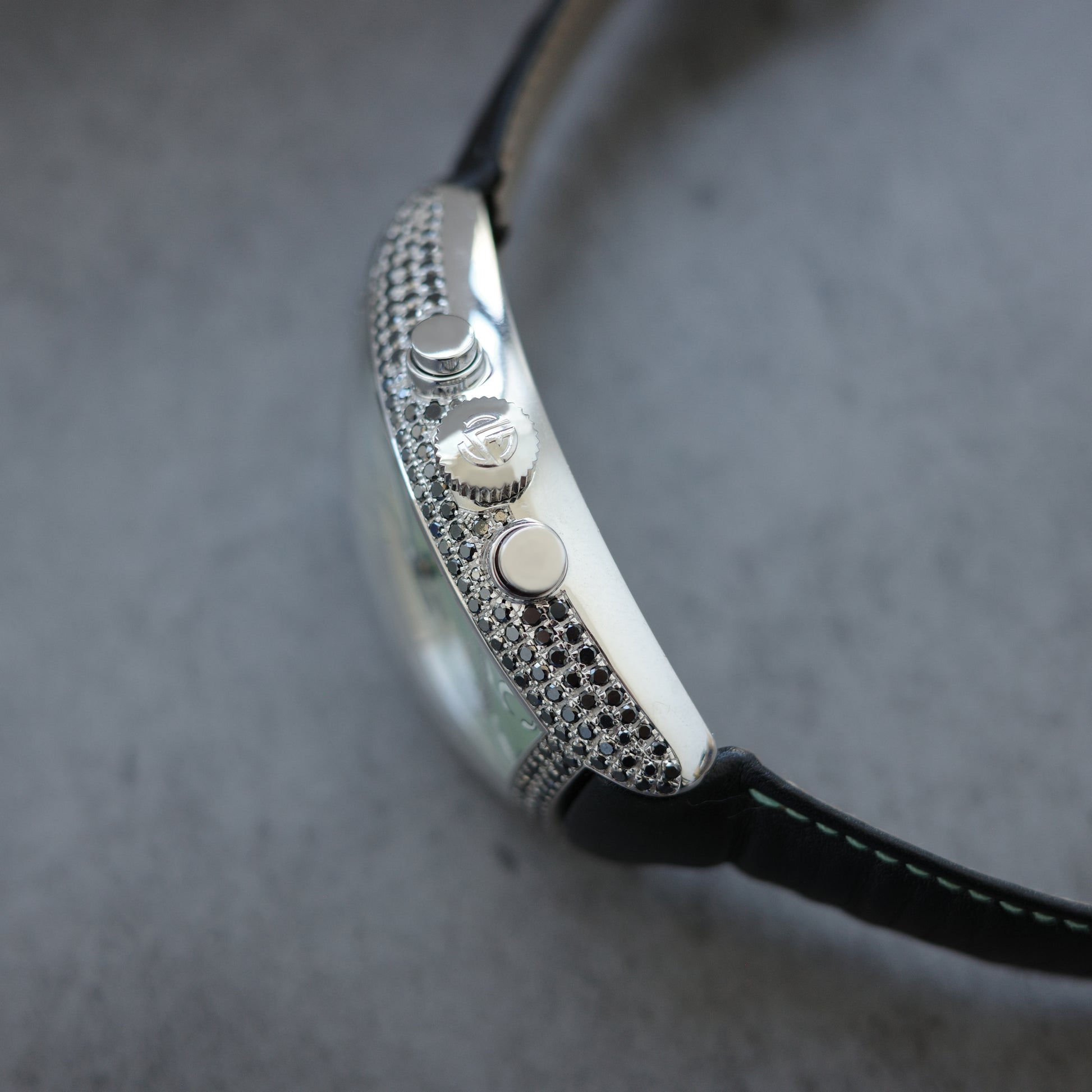 Theo Fennell (a British Jewelry Designer) and Franck Muller collaborated a few times, releasing a few limited edition steel watches in quantities around 50pcs. Along with these, special editions were made in precious metal and were significantly more limited. Numbered 03/03, this final piece in the Nile series is unlike the other two known examples, which were set only with white diamonds and sold publicly at auction (The last one hammered for $27k USD in 2022). This watch stands apart with its distinctive black diamond setting, usually offered to important clients, making it a true one-of-a-kind among an already exclusive Nile trio.