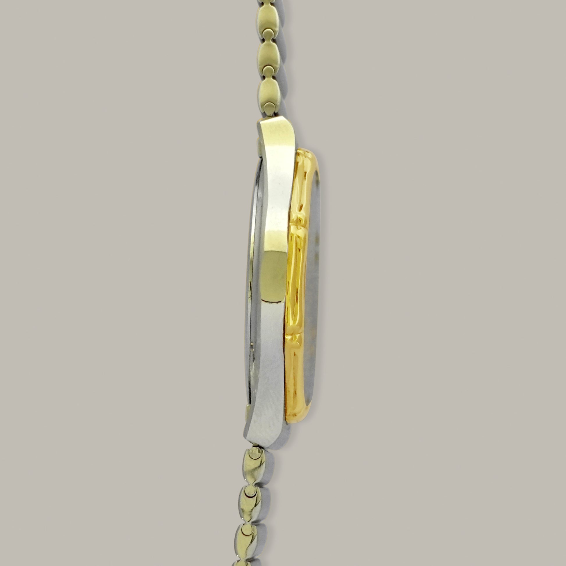 Longines is a Swiss watch brand founded in the 1800s, making it one of the oldest and well known watch manufacturers. While many modern Longines watches aren't our personal favorites- their vintage watches are a completely different story. This Longines from what we believe, the 1980s, is everything we love in a vintage watch. The integrated steel bracelet, interesting "bamboo" shaped gold bezel, unique patterned dial and original box to go along with it makes this watch hard to find & pass up.
