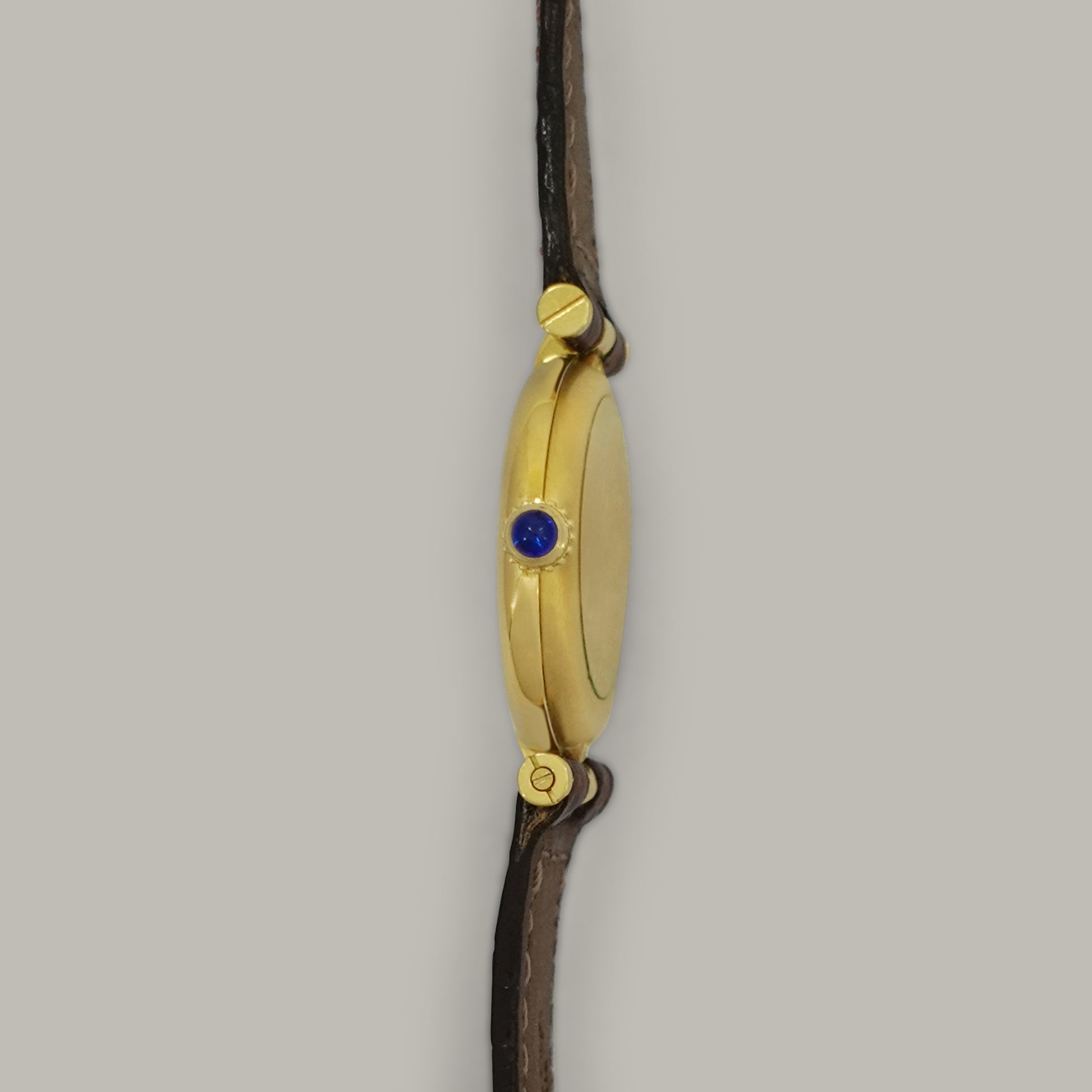 Cartier's Must de Cartier line was established in the 1973. For most of the line, Cartier opted to use 18K Vermeil (Real 18K Gold over Sterling silver) for their watch cases compared to their solid gold counterparts, and quartz movements instead of mechanical. This allowed Cartier to lower the retail price of these watches and to offer a more accessible option to the Maison's higher priced watches and accessories. Many Must de Cartier's were worn heavily over the past decades, causing the gold-plating to wear off, however, this watch was barely worn- with a pristine dial, case and even the sticker still present on the caseback.