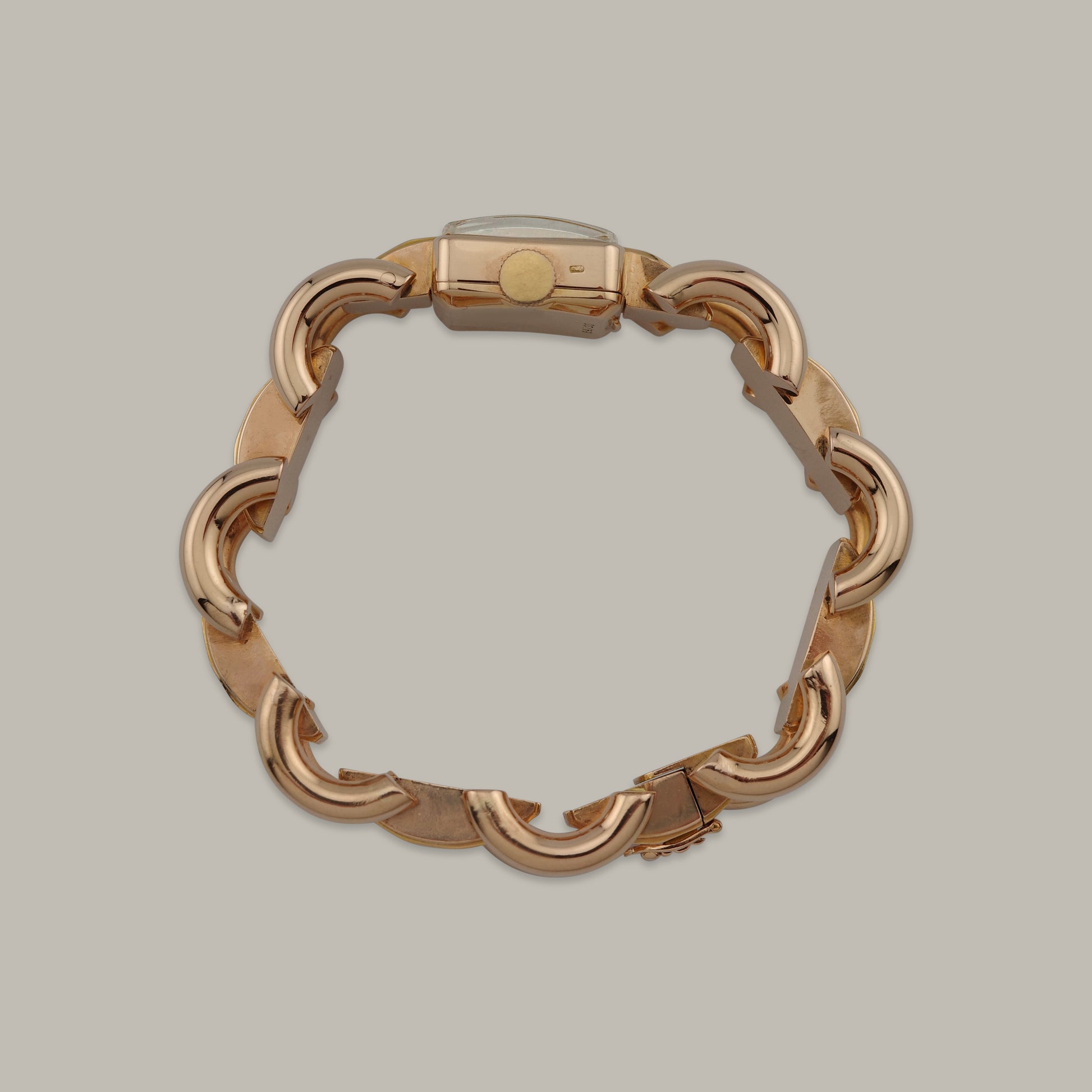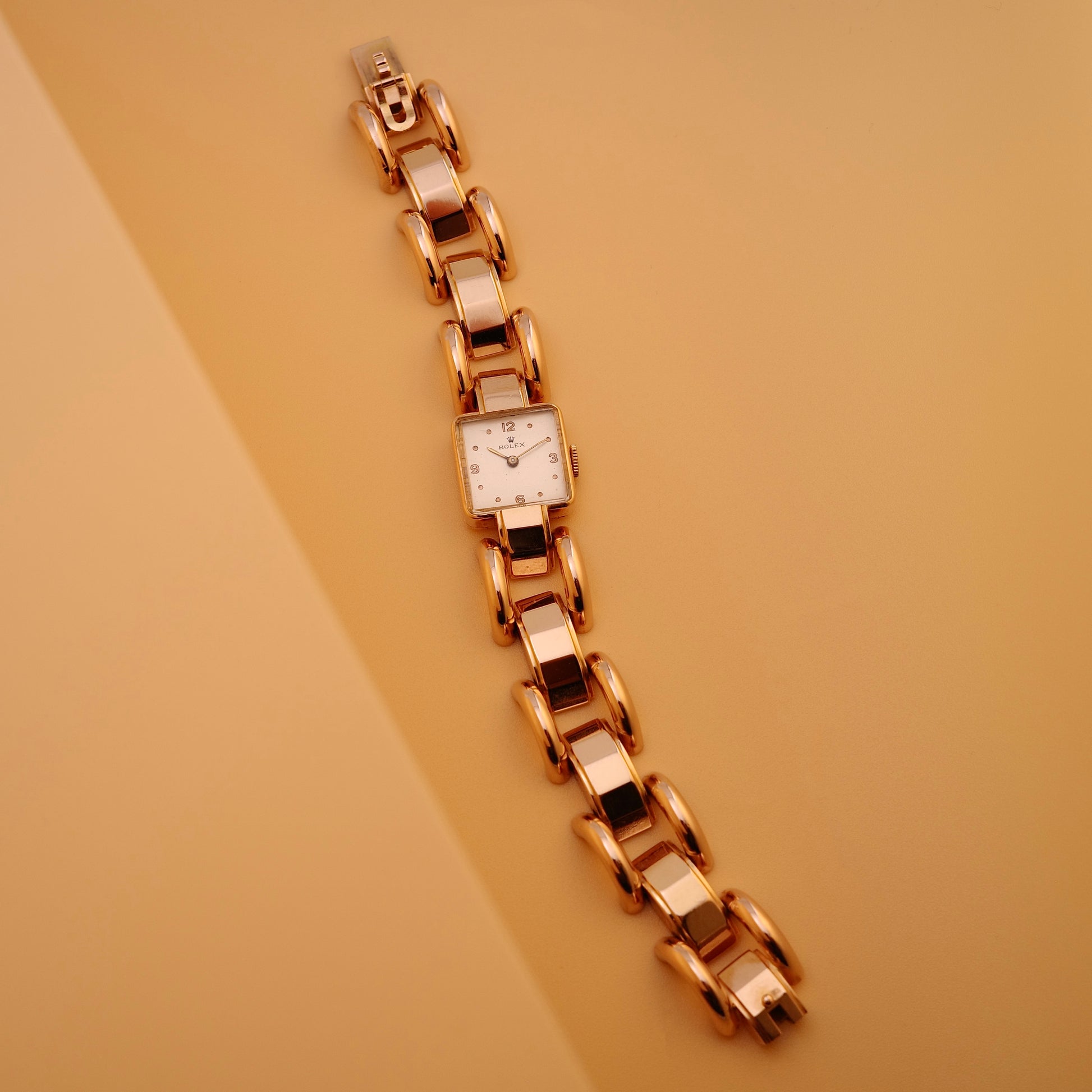 This isn't your typical Rolex ladies watch. This 18K rose gold cocktail watch dates to circa 1954 and features a square case with a silver dial, but the star of the show is no doubt the beautiful integrated bracelet with multi-faceted polished center links and adjoining San Marco links on each end. It's elegant, chic and the perfect blend of jewelry and watch.