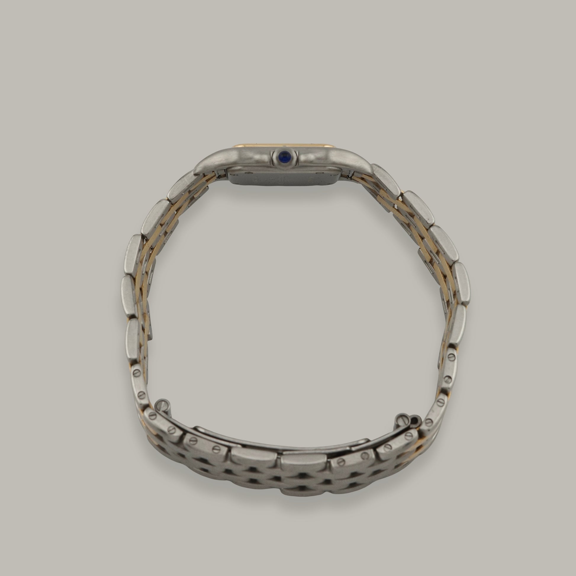 This watch is executed in two-tone stainless steel and real 18k yellow gold and features the two-row gold and steel bracelet, giving it a slightly dressier and more refined presence than full steel examples. The silver grained dial has aged beautifully, developing a soft and even cream hue, and is accented by blued steel hands, Roman numeral hour markers, and the discreet Cartier signature hidden at 10 o’clock.